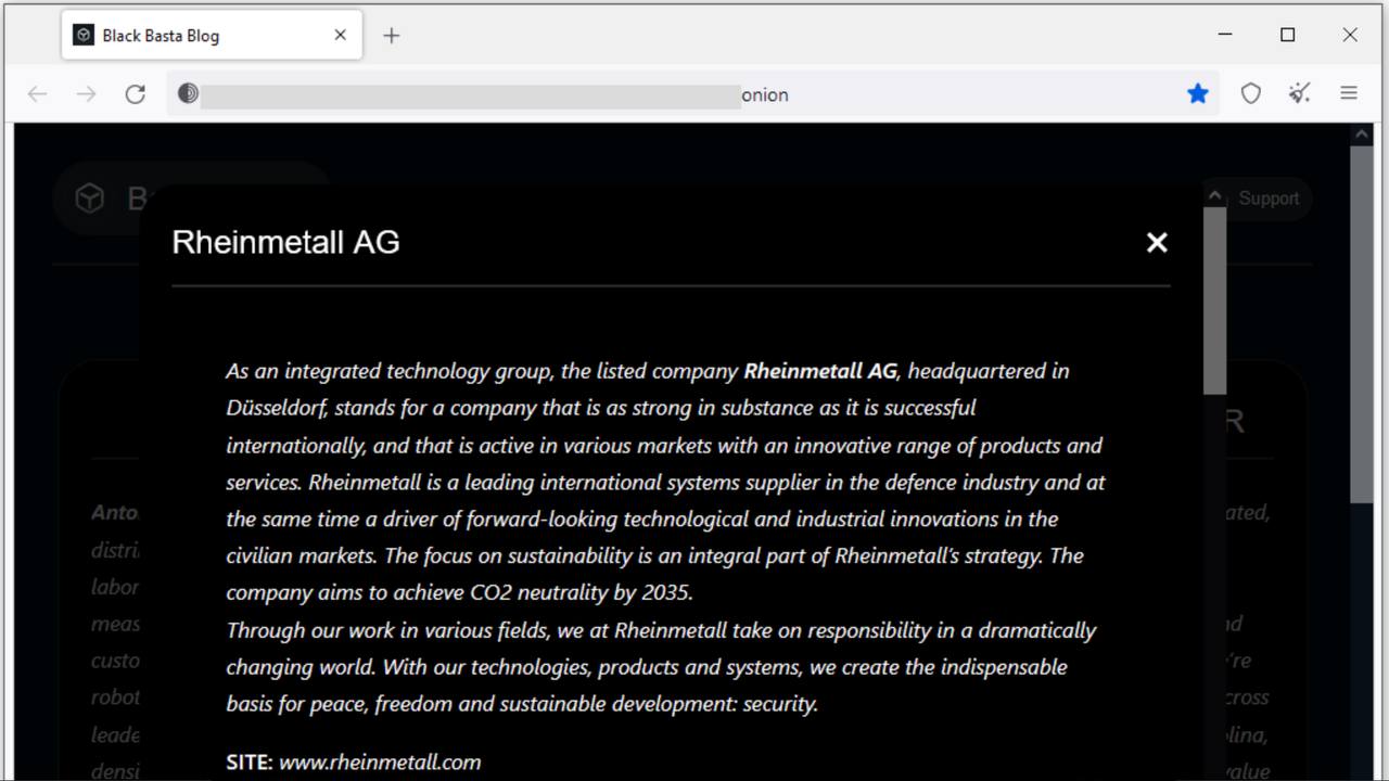 Другим резонансным событием стала атака на немецкий концерн Rheinmetall, которую предприняла вымогателей Black Basta, разместившая жертву на своем DLS.