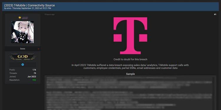 Награбленное разместили на теневой площадке, где указали, что базу слили в апреле 2023 года, которая содержит учетные данные сотрудников, частичные номера соцстрахования (SSN), адреса электронной почты, данные клиентов, продажи, аналитику T-Mobile и другую информацию.