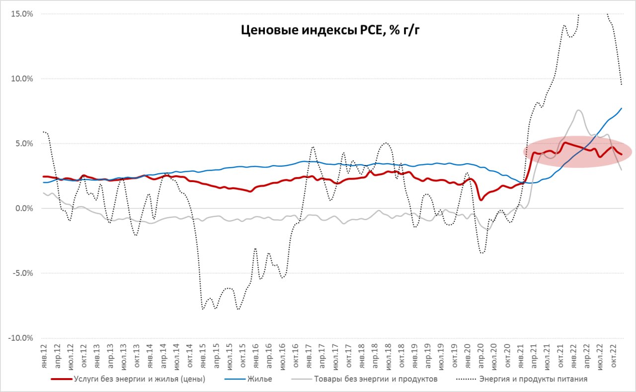 Но, помимо общих целей у нас есть некоторые ориентиры, на которые обещал смотреть Дж.Пауэлл, а это цены на услуги за вычетом энергии и жилья (арендные ставки пересматриваются постепенно и здесь велика инерция, потому на них ФРС ориентироваться не хочет). Эти цены растут на 4.2% г/г, что немного ниже уровней ноября (4.4%), но все в том же диапазоне, что и последние полтора года. Цены в секторе жилья продолжают лететь вверх (7.7% г/г), энергия и продукты – резко замедляются по причине падения цен на бензин, но еще высоко (9.5% г/г), товары без энергии и продуктов питания – ожидаемо замедляются (3.0% г/г).
