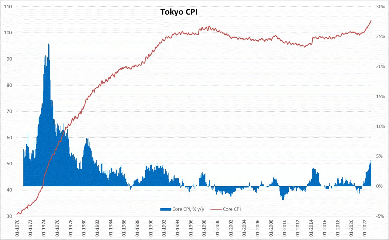 Япония публикует данные по инфляции в Токио чуть раньше основных данных и январь указывает на то, что ускорение инфляции продолжается. За январь цены в Токио выросли на 0.6% м/м и 4.4% г/г – максимальный годовой прирост 1982 года. Инфляция без учета свежих вощений составила 0.3% м/м и 4.3% г/г – рекорд с 1981 года. Хотя основная инфляция здесь – это продукты питания (7.2% г/г) и энергия (26% г/г), которые обеспечивают 2/3 текущей инфляции. Но и все остальные составляющие продолжают ускоряться, без учета энергии и продуктов питания цены растут на 1.7% г/г, что стало максимальным значением с 1998 года.