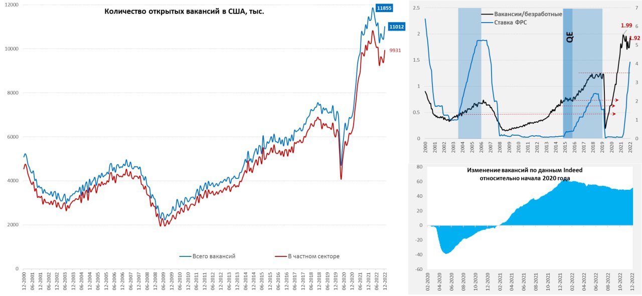 Похоже BLS решила помочь ФРС принять решение, опубликовав сегодня отчет по открытым вакансиям в экономике США за декабрь. Достаточно неожиданно количество вакансий резко выросло до 11 млн (+572 тыс.), т.е. максимального за 5 месяцев значения. В частном секторе количество вакансий выросло до 9.93 млн (+551 тыс.), указывая на усиление дефицита рабочих рук. Причем данные вполне подтверждаются частными источниками вроде Indeed, где тоже фиксируется рост вакансий. В итоге количество вакансий на конец 2022 года превышало количество безработных в 1.92 раза❗️ Количество самостоятельных увольнений (как правило в поисках лучшей работы) по-прежнему превышает 4 млн в месяц. Рост вакансий наблюдался в большинстве секторов, кроме IT – здесь вакансии резко сократились, зато стремительно росли в индустрии отдыха и гостиничного бизнеса.