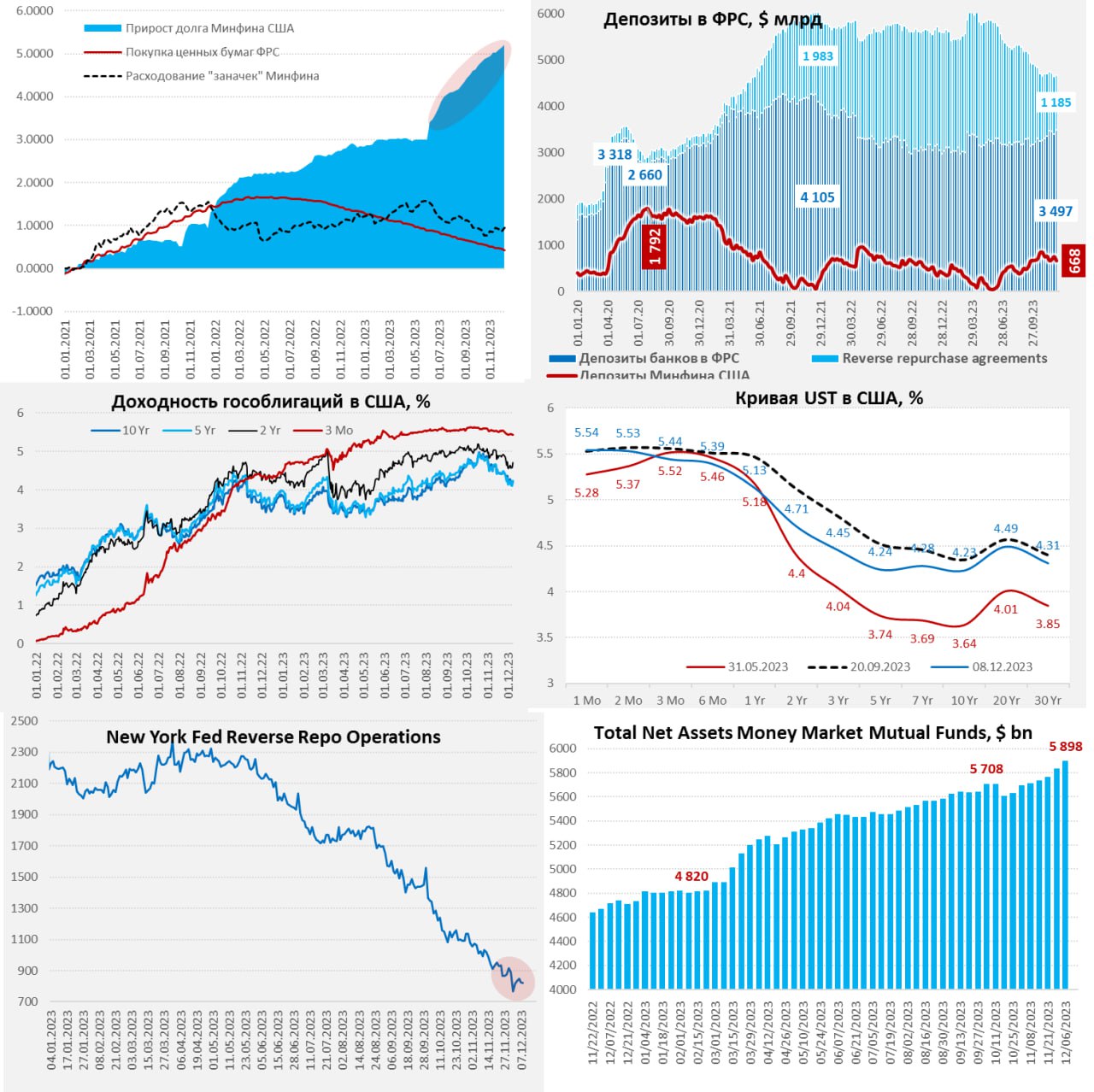 В таких условиях активы фондов денежного рынка (MMF) продолжают пухнуть и за прошлую неделю прибавили еще $62 млрд, а с марта выросли более, чем $1 трлн, приблизившись к $5.9 трлн. Кривая госдолга скорректировалась к концу недели, но изменения в целом за неделю были несущественными, 15 декабря очередная порция выпуска облигаций – рынок опять может немного раскачать.