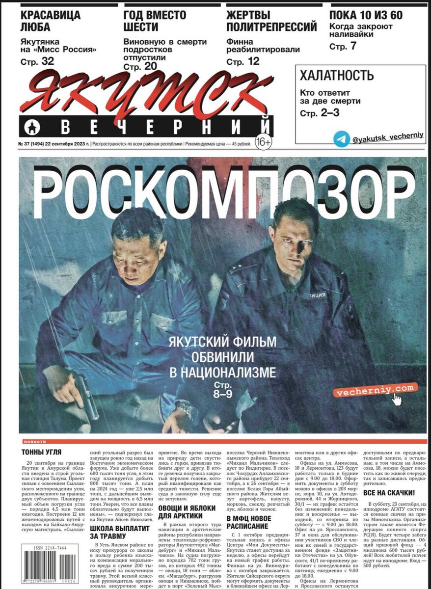 Бурно обсуждают "наезд" Роскомнадзора на якутский фильм «Айта», где невиновного русского якуты неоднократно избивают и покушаются зверски расправиться. В качестве протеста, "Вечерний Якутск" вышел с обложкой где вместо…
