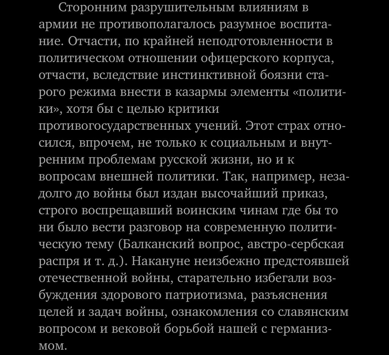 3. Нет «патриотического угара» (в том смысле, в каком его употребила давеча госпожа Захарова). Есть борьба за выживание, возможное только в абсолютной консолидации общества, иными словами — тыла. У нас в истории есть два примера: Первая мировая и Вторая мировая (ВОВ). В первом случае консолидации не было (более того, даже «пробуждение здорового патриотизма» было де факто под запретом, о чём в частности писал в своих мемуарах Деникин (цитата, пугающая своей актуальностью, в иллюстрации)). Во второй — консолидация была, и была жесточайшая цензура и политическая работа. Чем закончились обе, думаю, напоминать не нужно. Вопрос только в том, как мы хотим, чтобы закончилась нынешняя. И этот вопрос, в частности, хочется адресовать верхам, особенно тем, что рассказывают об "испугавшихся патриотах".