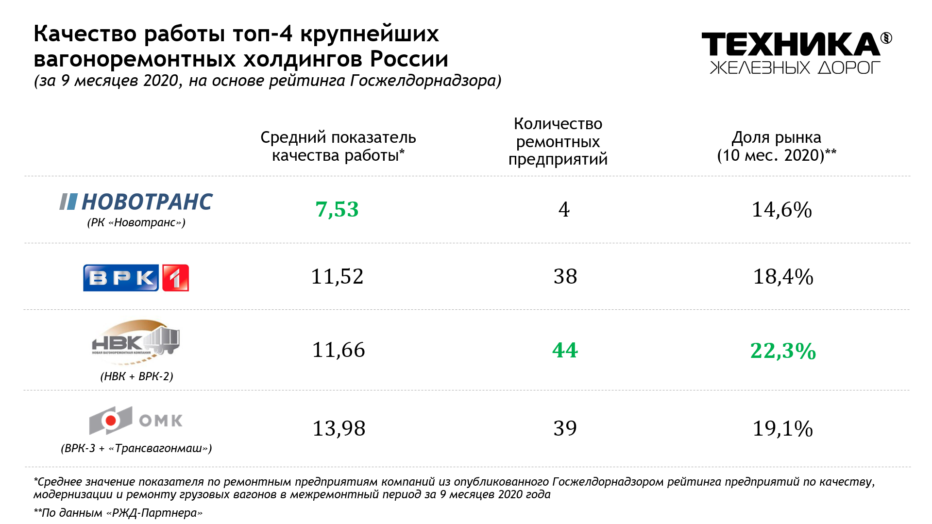 Справочно: показатели качества работы крупнейших вагоноремонтных холдингов России в рейтинге Госжелдорнадзора