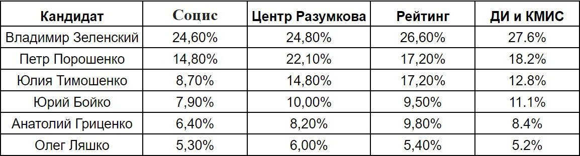 Выборы президента Украины состоятся 31 марта. Сегодня последний день, когда можно публиковать социологические опросы, мы решили свести все самые авторитетные в одну табличку. Тройка лидеров неизменна – Зеленский, Порошенко и Тимошенко. Подробнее об опросах можно прочитать по ссылкам: Социс, Центр Разумкова, Рейтинг, ДИ и КМИС.