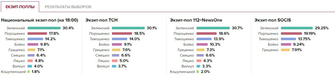 Владимир Зеленский: «Экзит-полов много, победитель – один. Нам все равно, с кем быть во втором туре... Мне уже сказали, что есть какие-то фейки: мы с кем-то уже "договариваемся, объединяемся". Мы ни с кем не договариваемся. Мы молодые люди, мы не хотим, честно говоря, видеть все то прошлое в своем будущем, в будущем нашей страны».