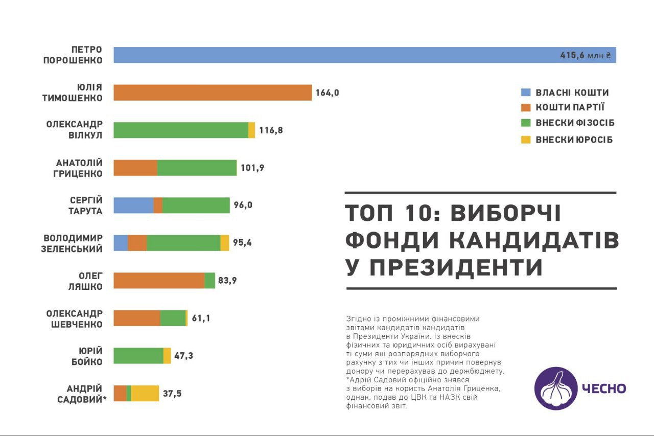 В этом рейтинге безоговорочные лидеры действующий президент Петр Порошенко и Юлия Тимошенко. Предварительный анализ подготовлен движением «Чесно». Предварительный, потому что еще будет второй тур и траты «счастливчиков» могут удвоиться и даже утроиться.