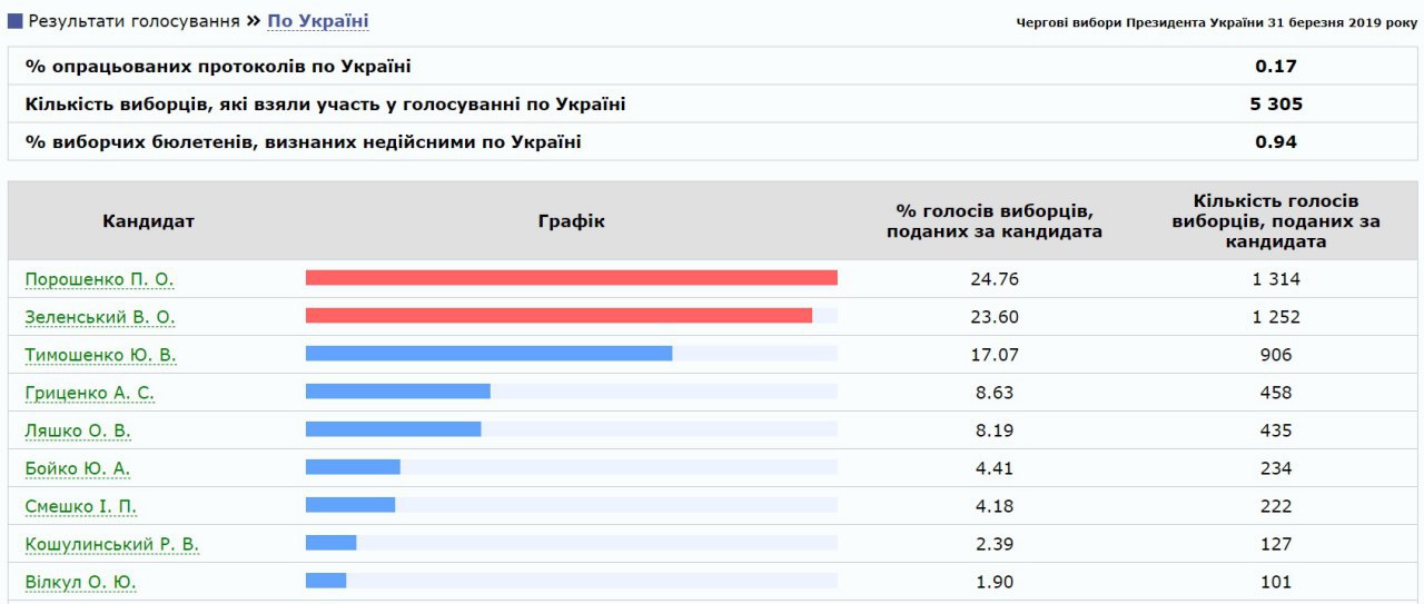 Официально результаты должны быть установлены территориальными комиссиями до 5 апреля, до 10 апреля должен быть составлен соответствующий протокол ЦИКом. Если ни один из кандидатов не наберет более 50% голосов, ЦИК обратиться к Верховной Раде с представлением о назначении повторных выборов президента Украины, которые состоятся 21 апреля (второй тур, куда выйдут два лучших кандидата). Подробно и вся статистика – ЗДЕСЬ.