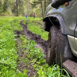 Тихим ходом вдоль берёз и сосен катим до места назначения. Как видите, дорога оказалась интересной: мокрая размытая лесная колея, подъёмы и спуски. Не всё далось с первого раза, но больших сложностей мы не встретили.