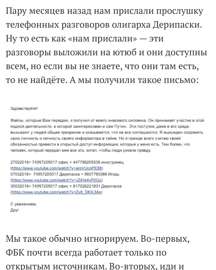 Что же теперь? История получила не менее «загадочное» продолжение :) Навальный продолжает мочить Дерипаску, используя разнообразные странности и совпадения, вдруг попадающие под руку. Теперь нам показали анонимное письмо от доброжелателя, который выложил записи в ютуб и поделился ими только (!!!) с Навальным. Чертовщина и фуфло, скажу я вам.