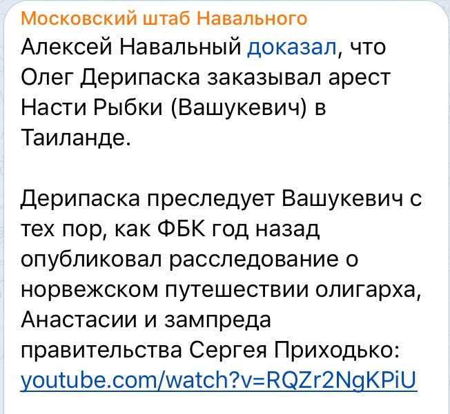 Навальный хватанул заказ на Дерипаску, который исполнялся через линию с Рыбкой, которая (в свою очередь) «случайно» засветилась перед Навальным и ФБК, проведя в августе 2017 года бессмысленную, но провокационную акцию в московском штабе. После чего Албуров «случайно» залез в инстаграмм и на открытой (!) странице нашёл желанные фото Рыбки с Дерипаской. Далее пошло и поехало по фбкашному шаблону - заказ был выполнен.