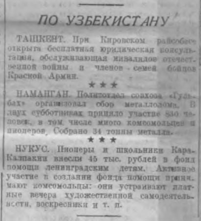 ТАШКЕНТ. При Кировском (сегодня — Юнусабадский район) райсобесе открыта бесплатная юридическая консультация, обслуживающая инвалидов отечественной войны и членов семей бойцов Красной Армии.