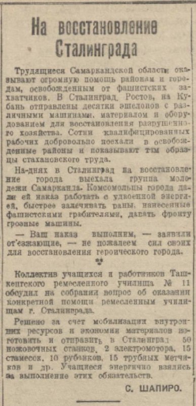 На днях в Сталинград на восстановление города выехала группа молодёжи Самарканда. Комсомольцы города дали ей наказ работать с удвоенной энергией, быстрее залечивать раны, нанесённые фашистскими грабителями, давать фронту грозные машины.