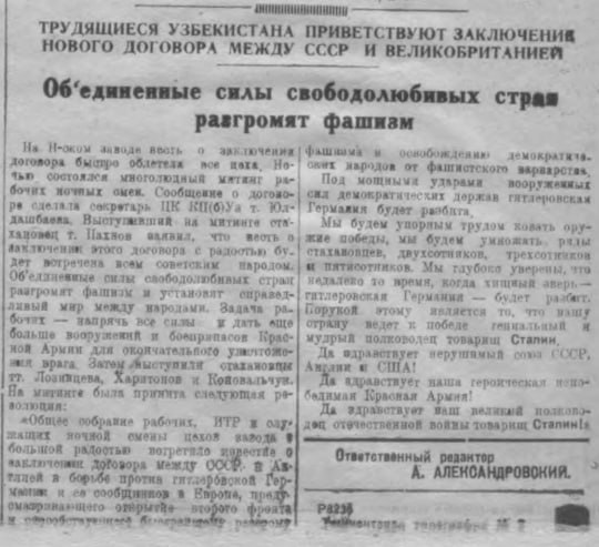 На Н-ском заводе весть о заключении договора быстро облетела все цеха. Ночью состоялся многолюдный митинг рабочих ночных смен. Сообщение о договоре сделала секретарь ЦК КП(б)Уз (Центрального комитета Коммунистической партии (большевиков) Узбекистана) т. (товарищ) Юлдашбаева. Выступивший на митинге стахановец т. Пахнов заявил, что весть о заключении этого договора с радостью будет встречена всем советским народом. Объединённые силы свободолюбивых стран разгромят фашизм и установят справедливый мир между народами. Задача рабочих — напрячь все силы и дать ещё больше вооружений и боеприпасов Красной Армии для окончательного уничтожения врага. Затем выступили стахановцы тт. Лозинцева, Харитонов и Коновальчук. На митинге была принята следующая резолюция: