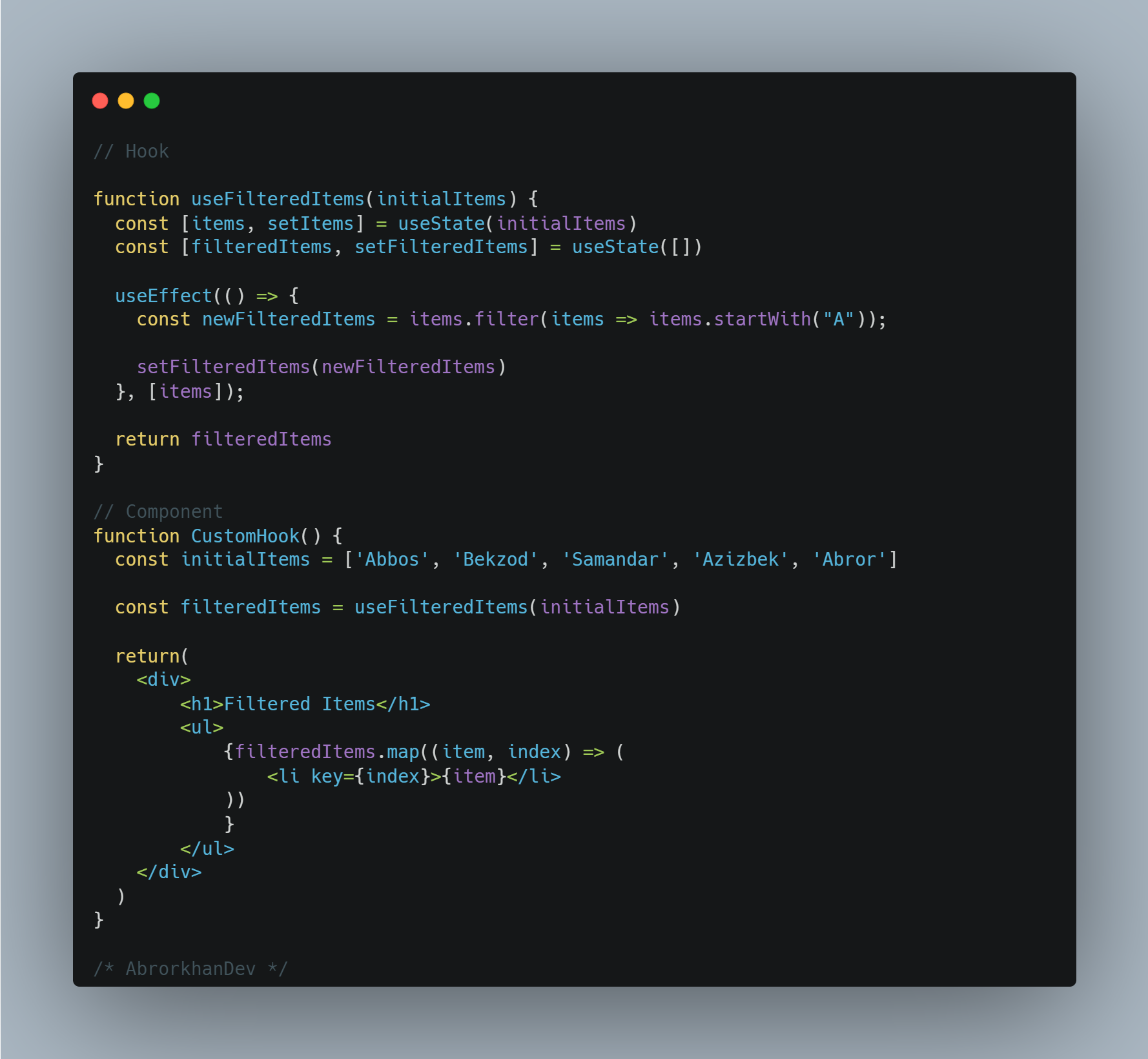 Aslida, shaxsiy hooklar-bu ma'lum bir kodni komponentlardan alohida faylga export qilish imkon beradigan xususiyatlari ham bor. Bu kodni testlash va qo'llab-quvvatlashni osonlashtiradi, komponentlarni yanada o'qilishi va tartibli qiladi. Ushbu funktsiyalar o'zining mantiqiy amallarini amalga oshirish uchun o'rnatilgan va boshqa shaxsiy hooklardan foydalanishi mumkin.