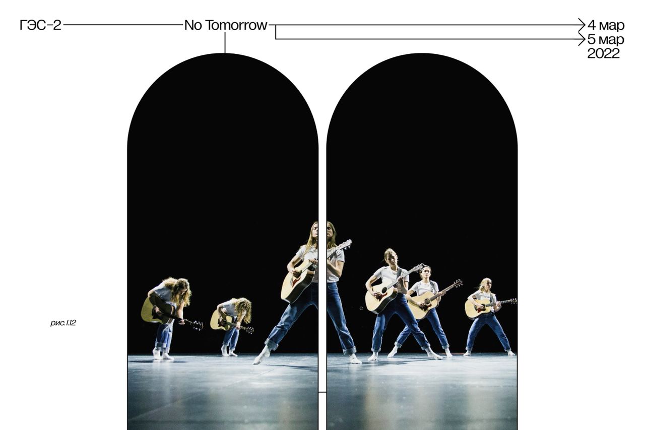 Один балет, шесть танцовщиц в одинаковых джинсах и белых футболках. Шесть гитар в руках, которые теряют вещественность и начинают напоминать изгибы тел. Участницы одновременно исполняют хореографическую композицию и аккомпанируют себе на гитарах. No tomorrow — это в равной степени и танцевальный этюд, и музыкальный эксперимент со звуком.