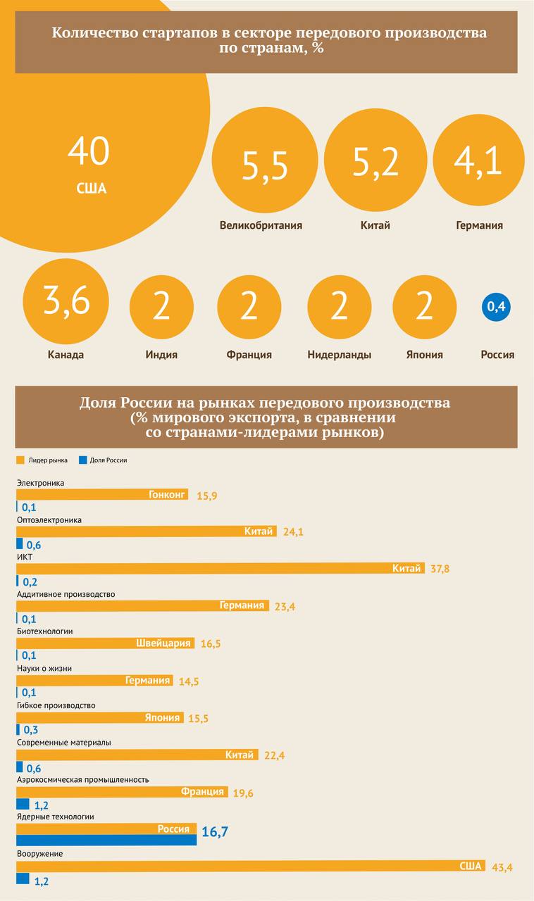 Масштабы экспорта передовой продукции имеют связь с позицией страны в международных рейтингах ведущих университетов. Почти половина из списка стран-лидеров экспорта продукции передового производства (Великобритания, Германия, Китай, Франция, Испания, Италия, Финляндия, Швеция, Дания, Австрия, Нидерланды, Бельгия, Швейцария, Япония, Корея, Канада) также занимают первые места по открытию новых технологичных компаний. Россия с долей 0,4% в мировом количестве стартапов уступает не только развитым странам, но и государствам БРИКС (за исключением ЮАР), и некоторым ”товарищам” по бывшему соцлагерю.
