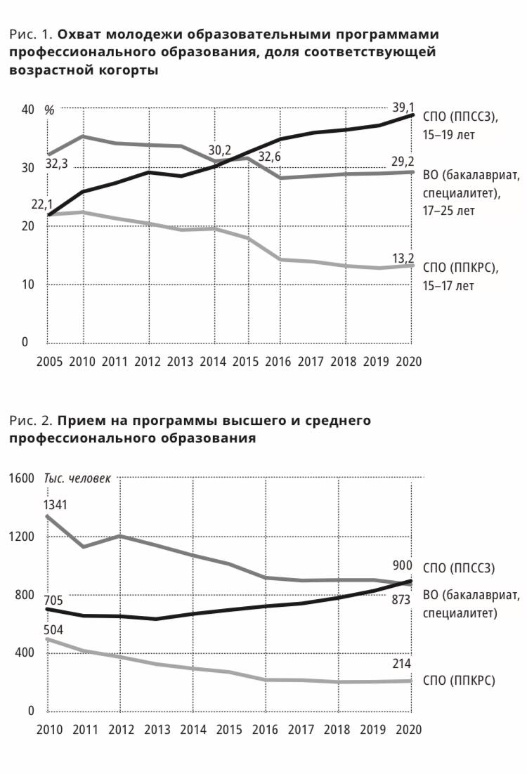 С середины 2010-х годов в России происходит перераспределение потоков абитуриентов между вузами и колледжами в пользу последних. Теперь охват молодежи высшим образованием устойчиво снижается при соответствующем росте охвата программами подготовки специалистов среднего звена. 2015 г. стал переломным: охват молодежи ППССЗ превысил охват программами высшего образования, начался стремительный рост числа заявлений, появился конкурс: 2,3-2,6 заявления на место в среднем по России. В 2019 г. конкурс в отдельных регионах, например в Тюменской области, доходил до 6 человек на место. Растет число обучающихся на платной основе. Если в 2014 г. доля приема по договору была выше бюджетного только в 9 регионах России, то в 2020 г. — уже в 58. Более половины поступивших на программы третичного образования в 2020 г.—это студенты колледжей. Можно сказать, что в 2010-е произошла смена тренда, и охват молодежи высшим образованием устойчиво снижается при соответствующем росте охвата программами подготовки специалистов среднего звена. Локомотивом спроса 9-классников стали ИТ-специальности, что соответствует запросу на массовые профессии в области цифровой экономики.