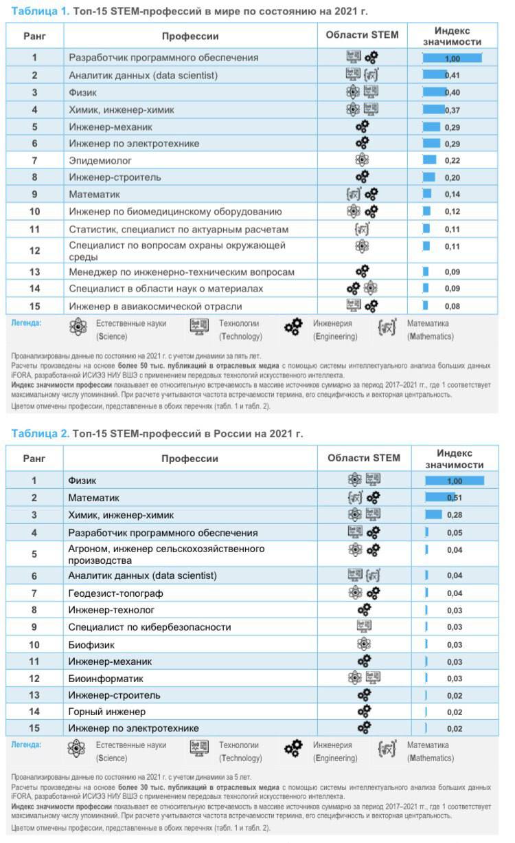 В мире по состоянию на 2021 г. абсолютными лидерами среди STEM-профессий являются разработчики программного обеспечения. Необходимость анализировать значительные объемы информации определяет спрос на аналитиков данных (data scientists) (No2). Последние входят и в российский перечень (No5); также в нем на девятой строчке находятся специалисты по кибербезопасности.