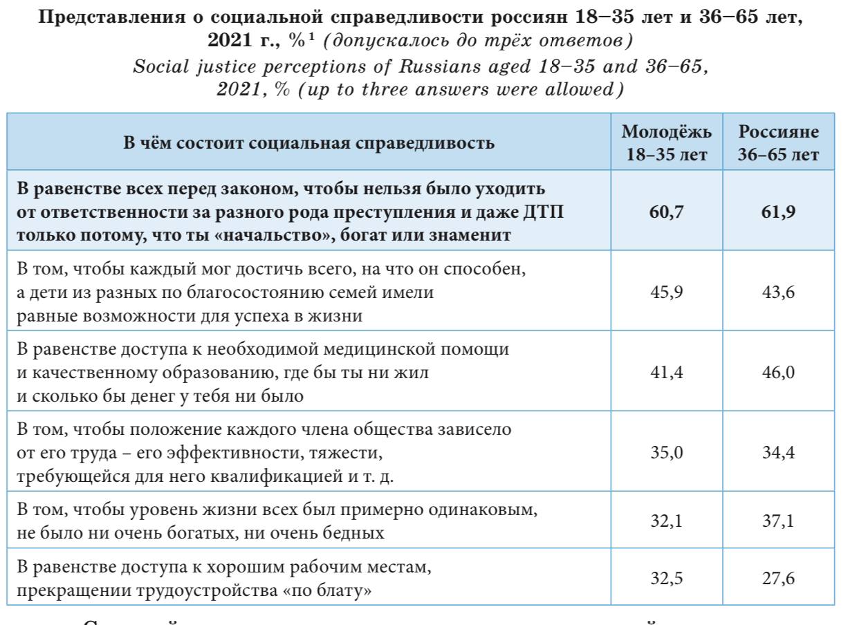 В ряде исследований неоднократно отмечалось, что именно социальная справедливость является для российской молодежи, как и россиян в целом, ключевым элементом желаемого будущего страны. Общее представление о социальной справедливости свидетельствует скорее о солидарности между россиянами разных возрастов, чем о ценностном расколе между ними.