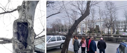 1. Платан по адресу Ставропольская 222 (Табрис). Проблема - есть скол ствола, дупло, грибок. Временно спил дерева приостановлен. Договорились, что в ближайшее время вместе с “люлькой” проведем еще один осмотр, уже аппаратными средствами. Есть сомнения, что данное повреждение аварийное.