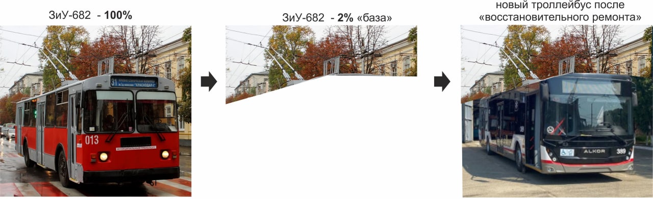 "Так, в первом троллейбусе, который прошел капитально-восстановительный ремонт в 2021 г., всего 2% использованных ранее комплектующих — это штанга (токоприемник)." источник