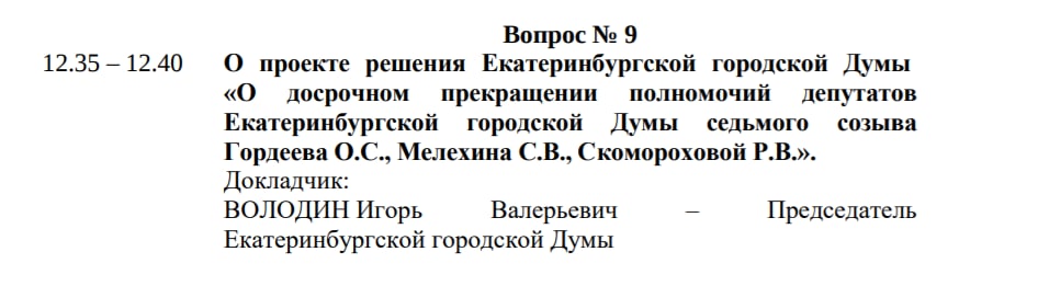 Гордеев со Скомороховой избирались в гордуму по спискам (как и в ЗакСО, впрочем), поэтому в их случае довыборов не будет, кому отдать мандаты решит свердловское отделение КПРФ. Гордеев избирался как лидер Чкаловской территориальной группы №18, поэтому первыми претендентами на его мандат являются другие представители этой группы — Максим Бурлаков (№2 в группе) и Виктория Ивачёва (№3), Скоморохова избиралась по общегородскому списку, поэтому судьбу освободившегося мандата решит Бюро Комитета Свердловского областного отделения КПРФ.
