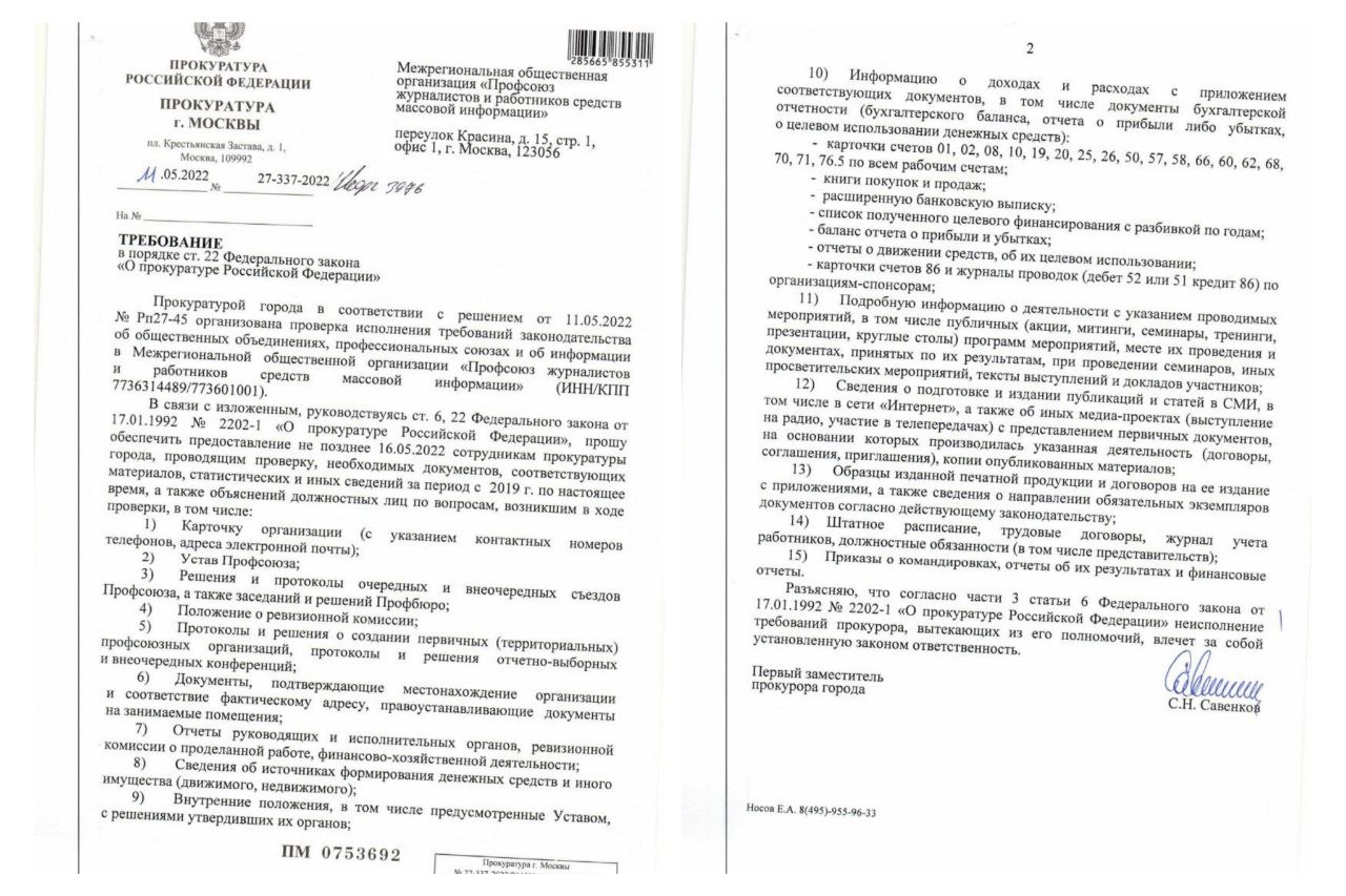 Прокуратура потребовала у независимого профсоюза СМИ данные о публикациях и выступлениях с 2019 года