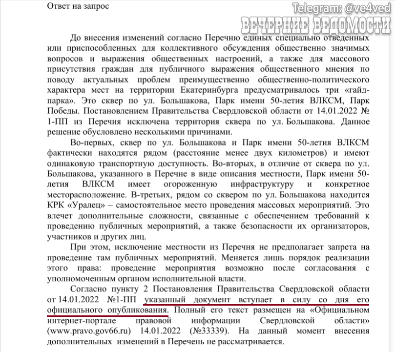 Ещё одним аргументом было то, что, согласно областному закону, любые постановления, касающиеся прав и свобод человека, вступают в силу только через 10 дней, но никак не на следующий день. Казалось бы, всё очевидно – затронуто право на свободу собраний но... полиция и МОБ 10 дней ждать не стали. По этому поводу «Вечерние ведомости» направляли запрос в Департамент информационной политики губернатора, на который получили 25 января ответ в виде текстового документа без подписи — будто в ДИПе чего-то опасались. И, видимо, не зря – в этом ответе по вопросу несоответствия постановления областному закону о правовых актах просто ещё раз процитировали фрагмент постановления, заявив, что оно вступает в силу с момента опубликования. А Свердловской областной суд вчера решил, что вступать в силу оно должно никак ранее, чем через 10 дней. Об этом @ve4ved рассказала юрист Вера Мангилева, подавшая к областному правительству и МОБу иск вместе с организатором той акции Александром Клокуновым. Исковые требования Клокунова и Мангилевой были поддержаны в суде прокуратурой, добавила юрист.