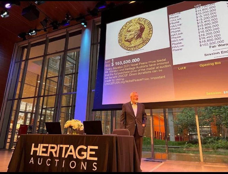 Медаль нобелевского лауреата, главреда «Новой газеты» Дмитрия Муратова была продана на аукционе Heritage за $103,5 млн. Трансляция велась на сайте аукционного дома.