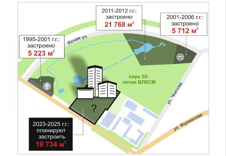 Если проект реализуют, это будет уже четвёртое сокращение парка 50-летия ВКЛСМ на последние 30 лет — ранее его территорию сокращали для строительства двух православных и одного протестантского храма, а также для строительства станции юннатов (она просуществовала там лишь 6 лет). Участок, который планируют застроить, в 2013 году не включили в зону ООПТ, при этом осенью 2023 года, по подсчётам активистов, на нём располагается порядка 200 деревьев.