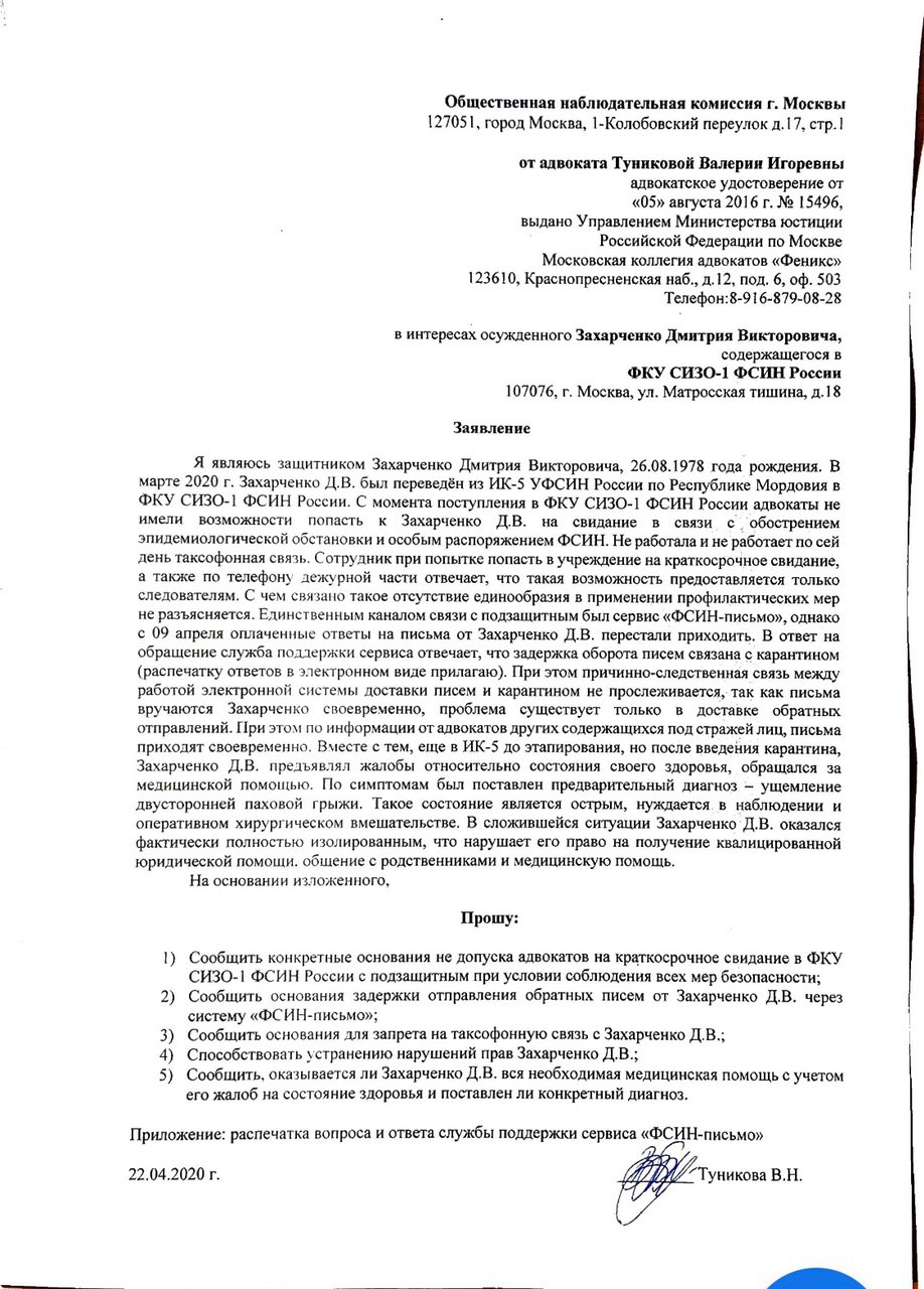 Уже написаны заявления в центральный аппарат ФСИН и ОНК с просьбой о проверке оснований, по которым не допускается связь с Дмитрием Викторовичем.