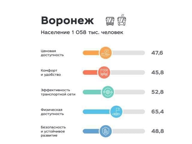 Итоговый средний балл Воронежа в исследовании составил 52,5. Результат складывался на основе оценки пяти ключевых факторов. Выше всего аналитики оценили физическую доступность общественного транспорта в областном центре (65,4), ниже всего – комфорт и удобство воронежских автобусов и троллейбусов (45,8). Также специалисты рассмотрели ценовую доступность, безопасность и эффективность транспортной сети. В итоге Воронеж занял последнюю 15-ю строчку среди миллионников в рейтинге. В числе 76 крупных населенных пунктов страны, представленных в исследовании, столица Черноземья оказалась на 63-й строчке, поднявшись за 2020 год на пять позиций.