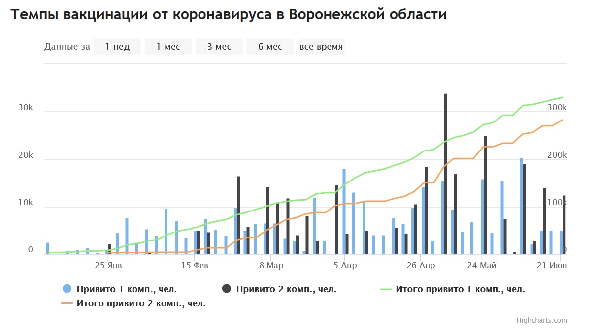 При этом в регионе от коронавируса вакцинировано почти 370 тыс. жителей, то есть 16% населения. Напомним, что минимальный план воронежских властей по вакцинации составляет хотя бы 50% - привить требуется 1 177 000 человек соответственно. Такими темпами он будет достигнут ориентировочно только через 547 дней.