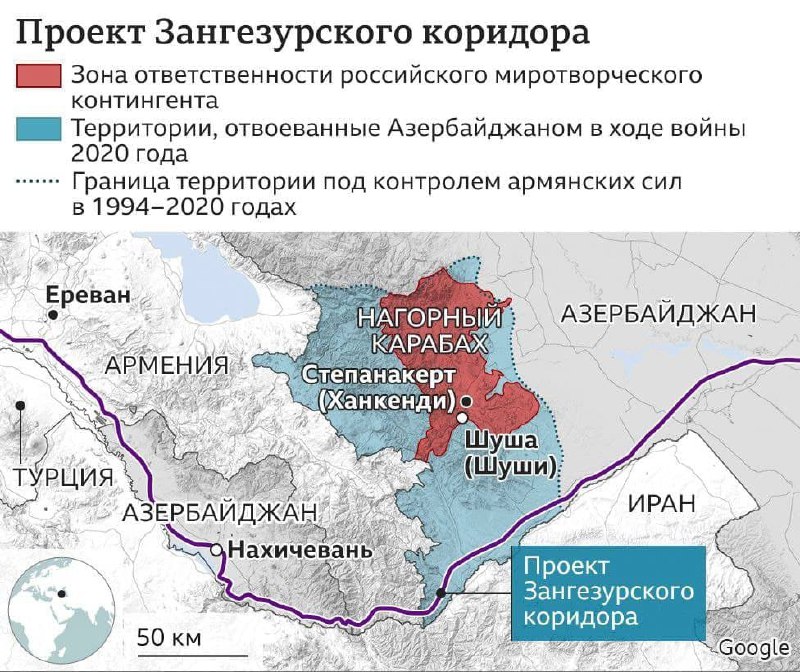 Азербайджан предлагал наделить Зангезурский коридор, который соединяет страну с Нахичеванью, экстерриториальным статусом, то есть фактически выделить из состава Армении. Несмотря на то, что Ереван, являясь членом пророссийского ОДКБ, просит ЕС и США помочь в переговорах с Баку, Москва продолжает поддерживать союзника.