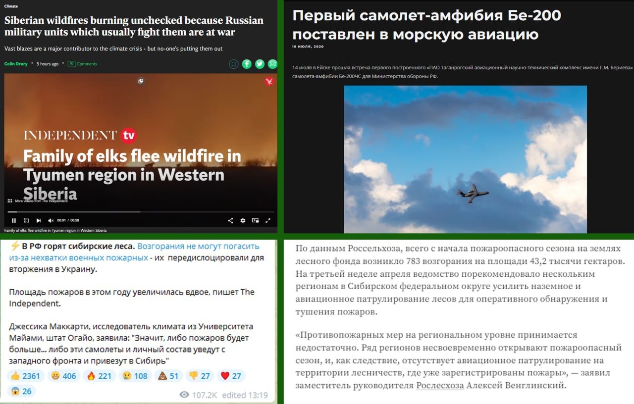 Фейк: Сибирские леса не могут потушить эффективно из-за нехватки военных пожарных и техники, они все задействованы в спецоперации на Украине. Из-за этого количество пожаров увеличилось вдвое. Об этом пишут американские и украинские СМИ.