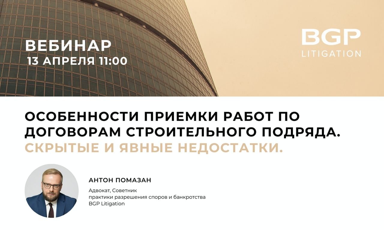 Коллеги, в следующую среду, 13 апреля, адвокат, советник практики разрешения споров и банкротства BGP Litigation Антон Помазан рассмотрит на вебинаре особенности приемки работ по договорам строительного подряда.