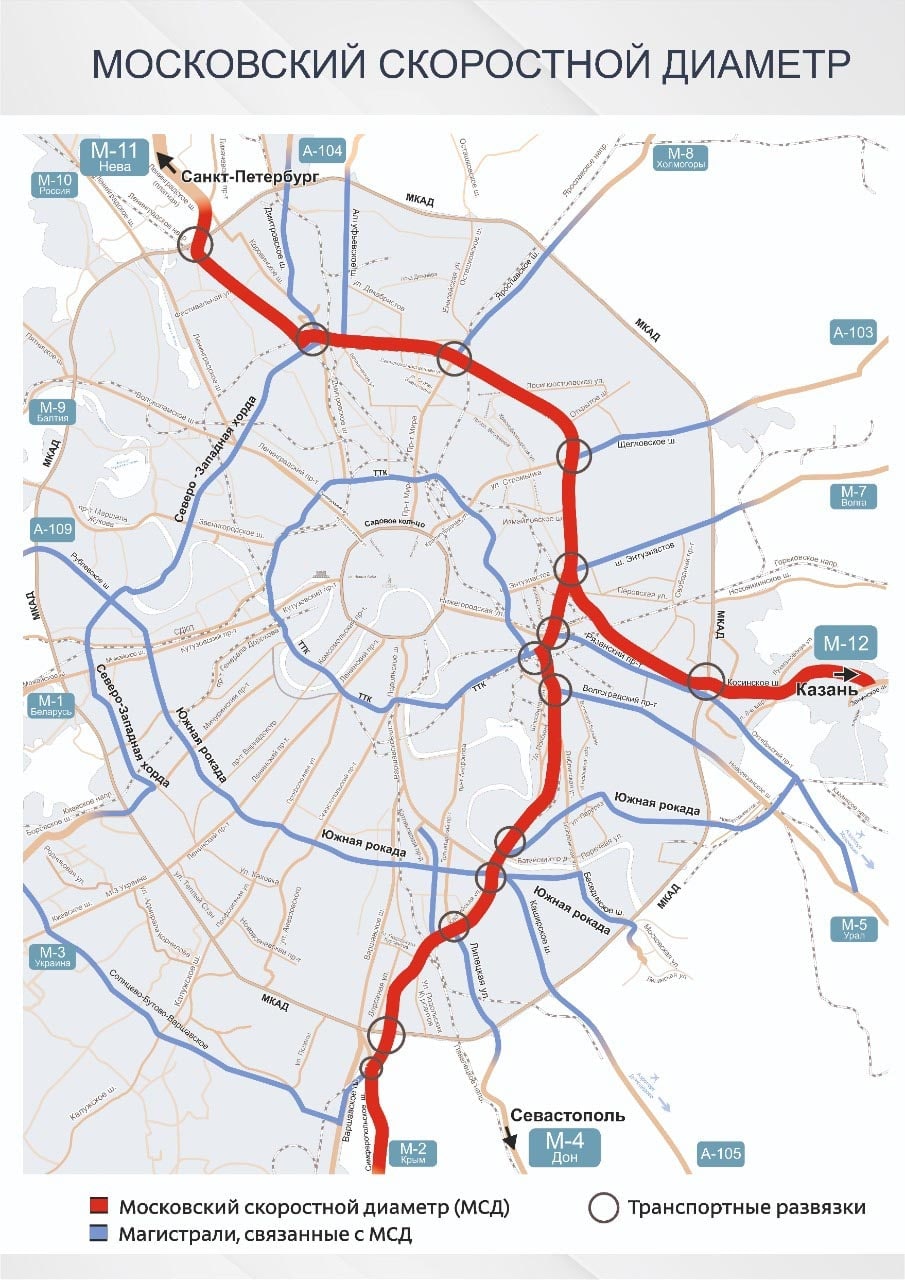 На севере продолжением МСД станет федеральная трасса М 11 «Москва — Санкт-Петербург». На востоке — будущая трасса М 12 «Москва-Казань». На юге — федеральная трасса М 2 «Крым» и новая магистраль «Солнцево — Бутово — Варшавское шоссе».