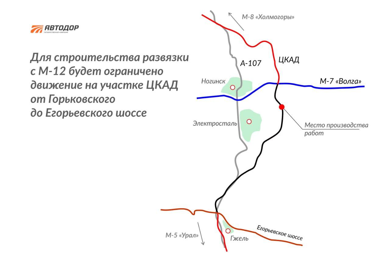 Автодор сообщил, что с апреля по июль будут проходить работы по строительству путепроводов, связывающих ЦКАД и М-12. Основные работы, требующие ограничения движения, будут проводиться ночью.