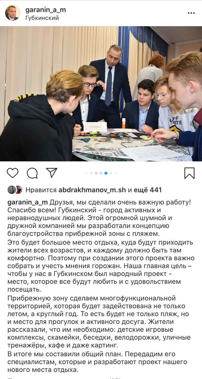 На этой неделе сразу вырвался вперёд Андрей Гаранин с постом об общественных обсуждениях концепции пляжной зоны в Губкинском. Видно, что мэр не шарахается от людей и не стесняется своего видения. Так держать!