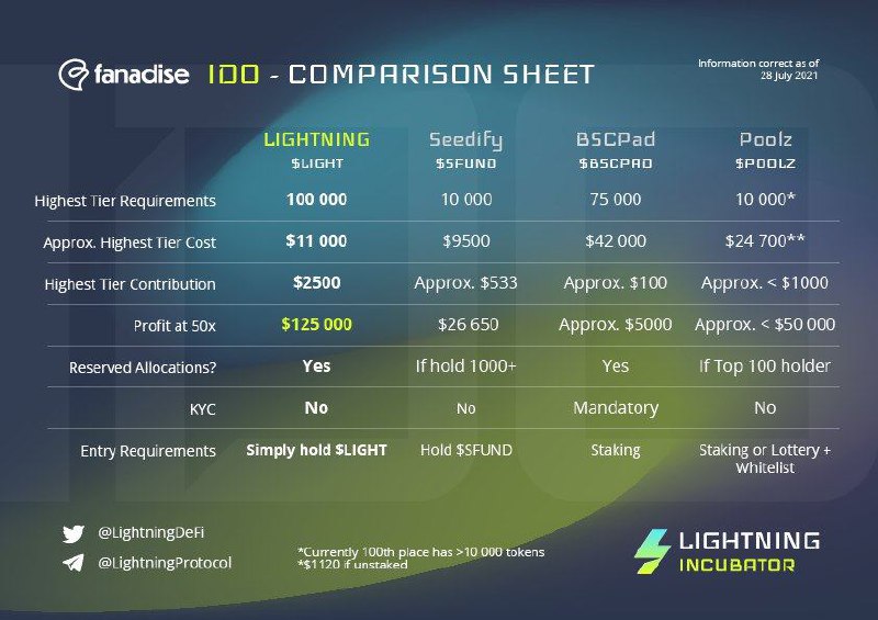 Если сравнивать с другими лаунчпадами, например BSCPad, то Ligtining выгодно отличается соотношением используемого капитала и полученной аллокацией. К тому же появится доходный стейкинг, а инкубационные проекты выходят сразу с аудитом.