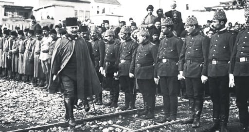 На фото: второй справа сидит Фахреттин-паша, прямо за его спиной стоит Наджи Кыджиман.