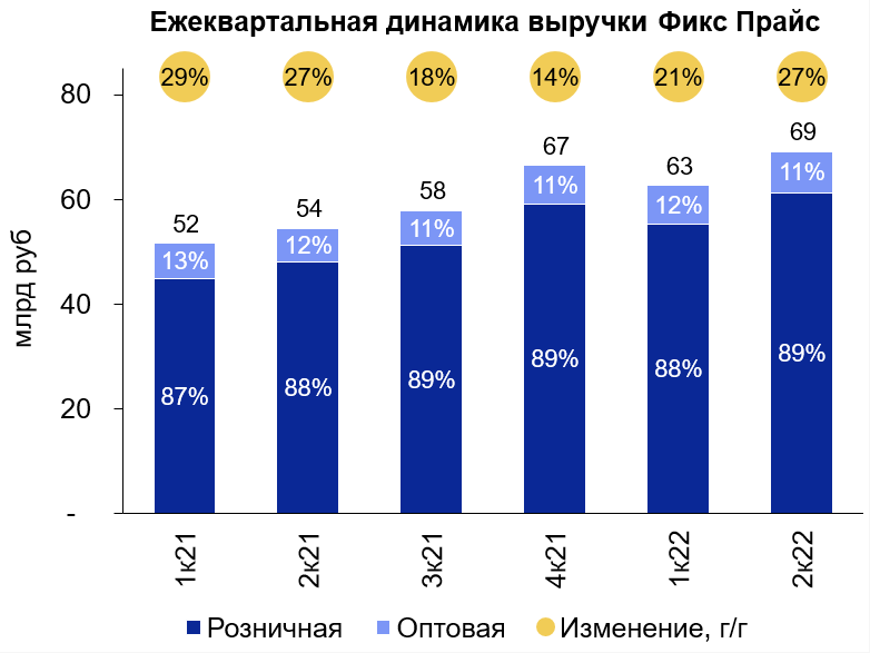 • Выручка выросла на 27% г/г в 2к22 до 69 млрд руб против +21% г/г в 1к22, несмотря на закупки впрок в марте.