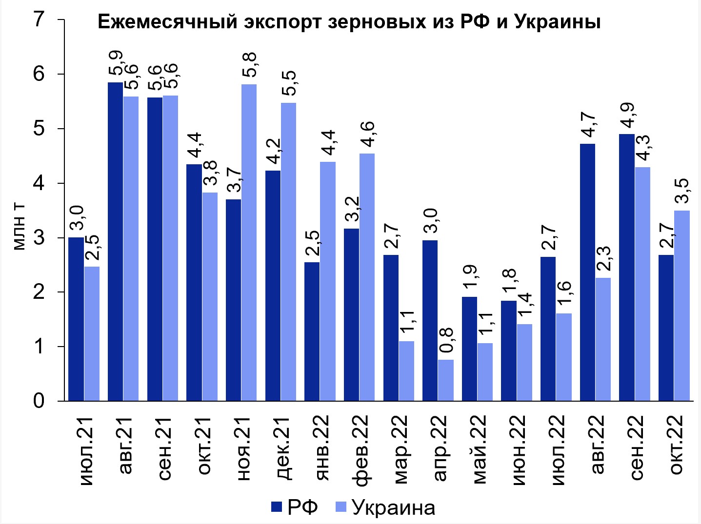 • Ключевая портовая инфраструктура Украины находится в Одессе и Николаеве (≈80% объемов). Сделка помогла восстановить экспорт с минимума в апреле (1 млн т) до 3.5 млн т в октябре, практически до исторических уровней. У России были претензии к сделке из-за конечных получателей зерна (доля поставок в нуждающиеся в продовольствии страны с низкими доходами оказалась ниже ожидаемой).