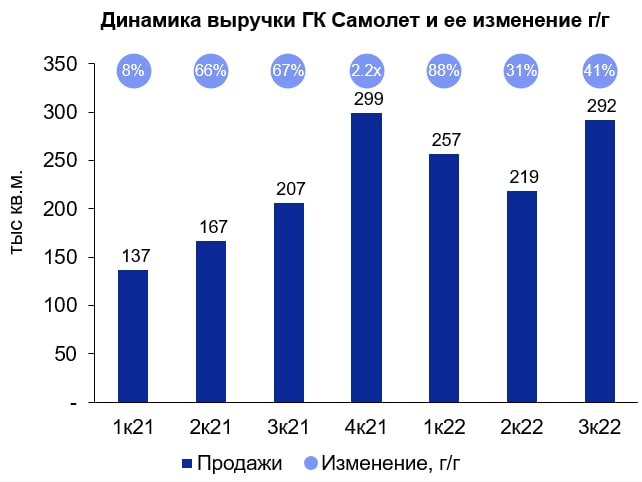 • Продажи выросли на 40% г/г до 292 тыс кв.м., показав ускорение против 30% во 2к22 и результируя в 54%-ном росте за 9м22. Основной драйвер - кратное увеличение количества корпусов в продаже.