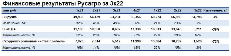 • Выручка осталась cопоставимой г/г (55 млрд руб) в 3к22. Падение цен в растениеводстве, масложире и свинине (-20% г/г в среднем) было компенсировано ростом цен в сахаре (+35%) и увеличением объемов мяса на Дальнем Востоке.