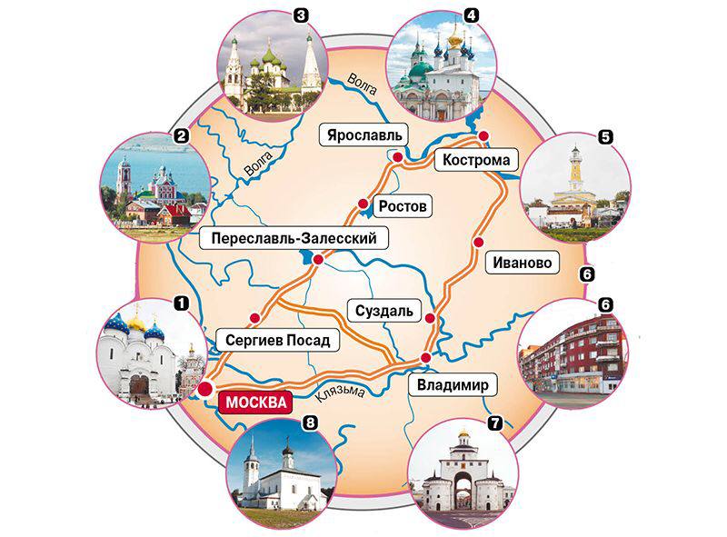 Этот популярный туристический маршрут проходит по древним городам в центральной части России (в прошлом – Северо-Восточная Русь), в которых сохранилось много памятников Древней Руси и в которые легко добраться из Москвы.