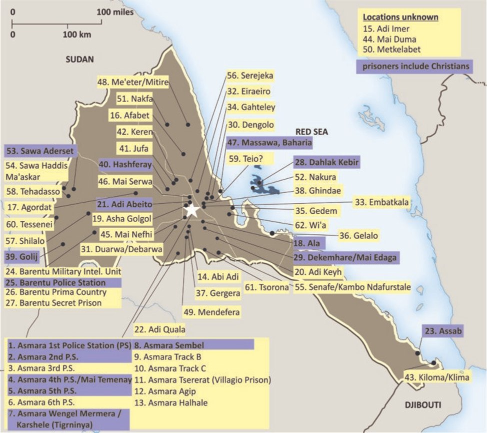 Со времени обретения независимости в 1993 г. Эритрея стала закрытой милитаризированной страной с жестким режимом въездных и выездных виз и раздутым карательным аппаратом. Все политические тюрьмы, центры содержания под стражей и трудовые лагеря находятся под контролем армии и спецслужб. Многие из них находятся под землей, напоминая средневековые подземелья, и лишены базовых удобств. Для содержания заключенных нередко используются металлические грузовые контейнеры, температура в которых порой достигает 50 градусов. Колоссальная карательная инфраструктура дополняется фактически неограниченной военной службой, растягивающейся на десятилетия (официальный срок призыва - 18 мес.), а военнослужащие периодически отравляются в "центры реабилитации" (фактически - военные тюрьмы).