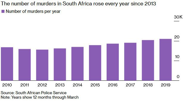 Всего за 2017-2018 финансовый год в стране было убито 20,3 тыс. человек, из которых 2,8 тыс. - женщины. В среднем в ЮАР гибнет одна женщина каждые три часа. В этом, по данным ВОЗ, ЮАР также опережает все остальные страны мира.